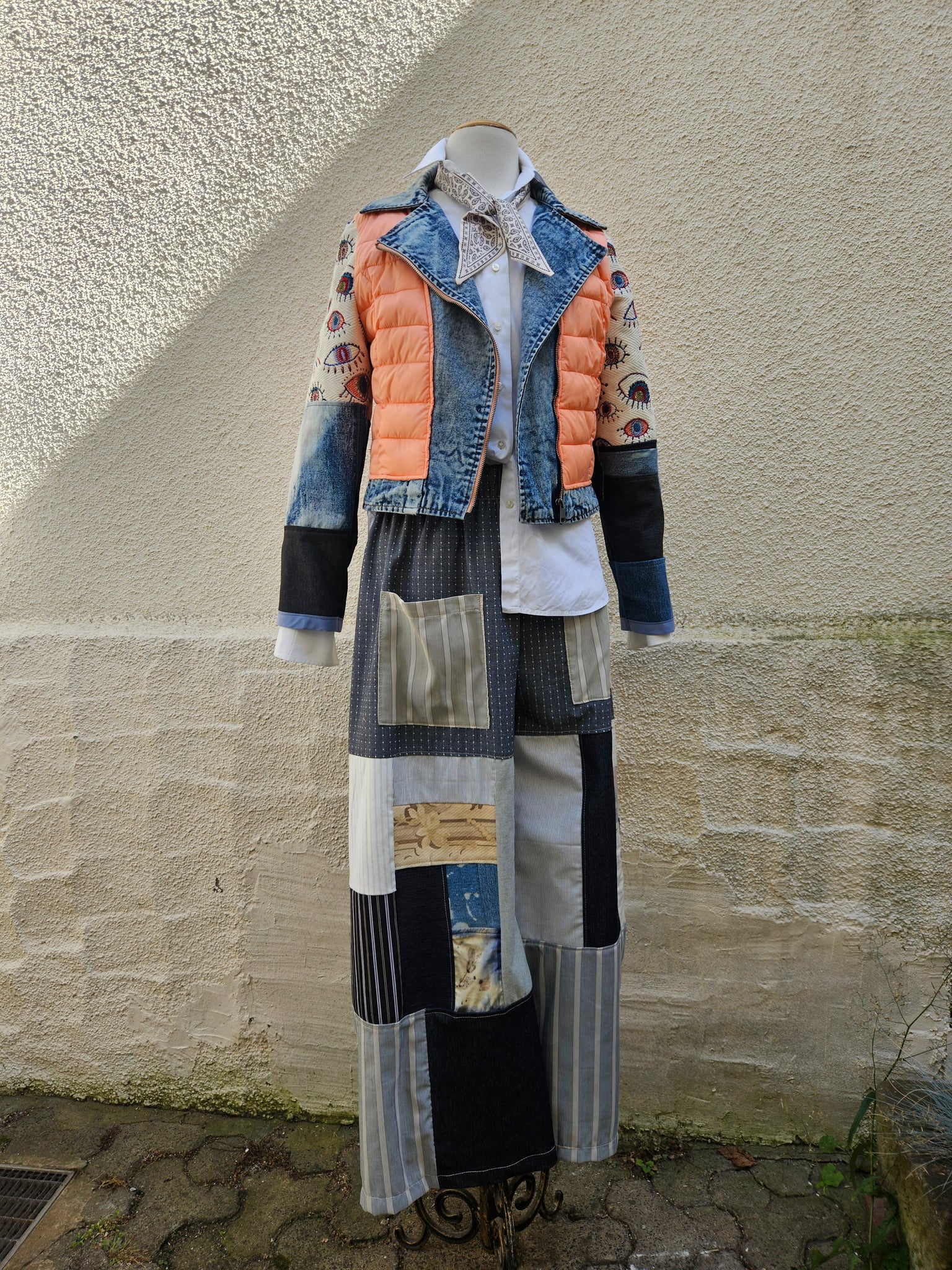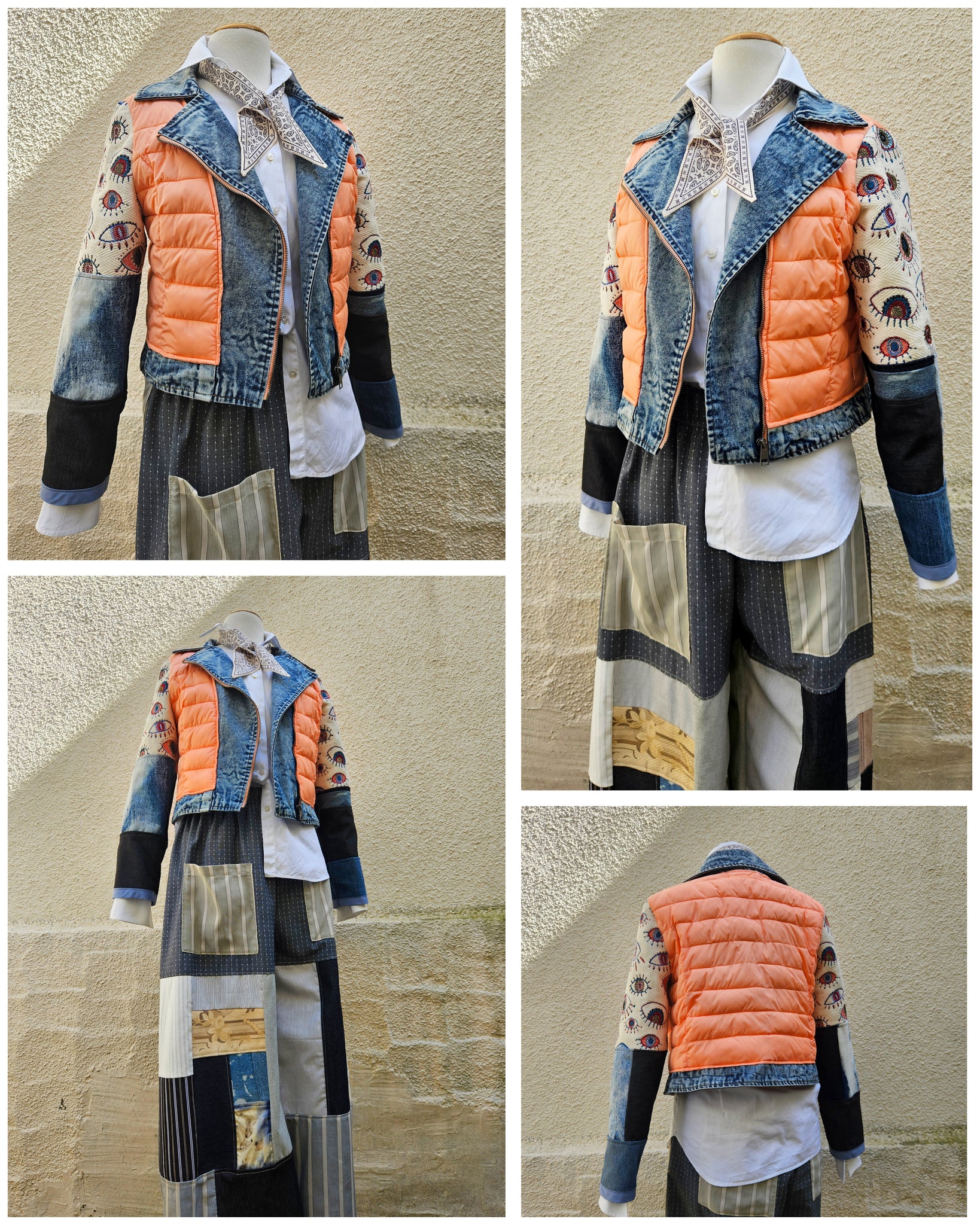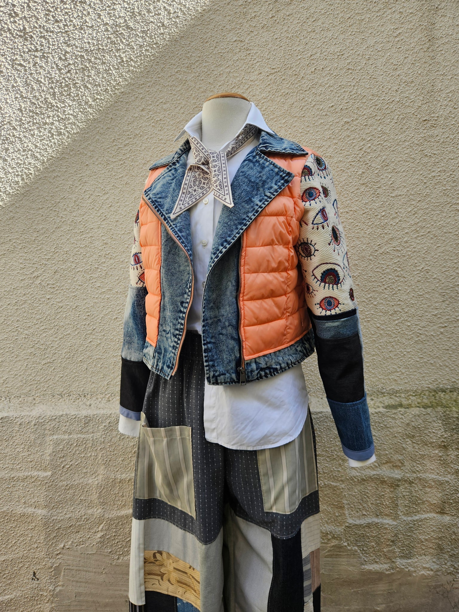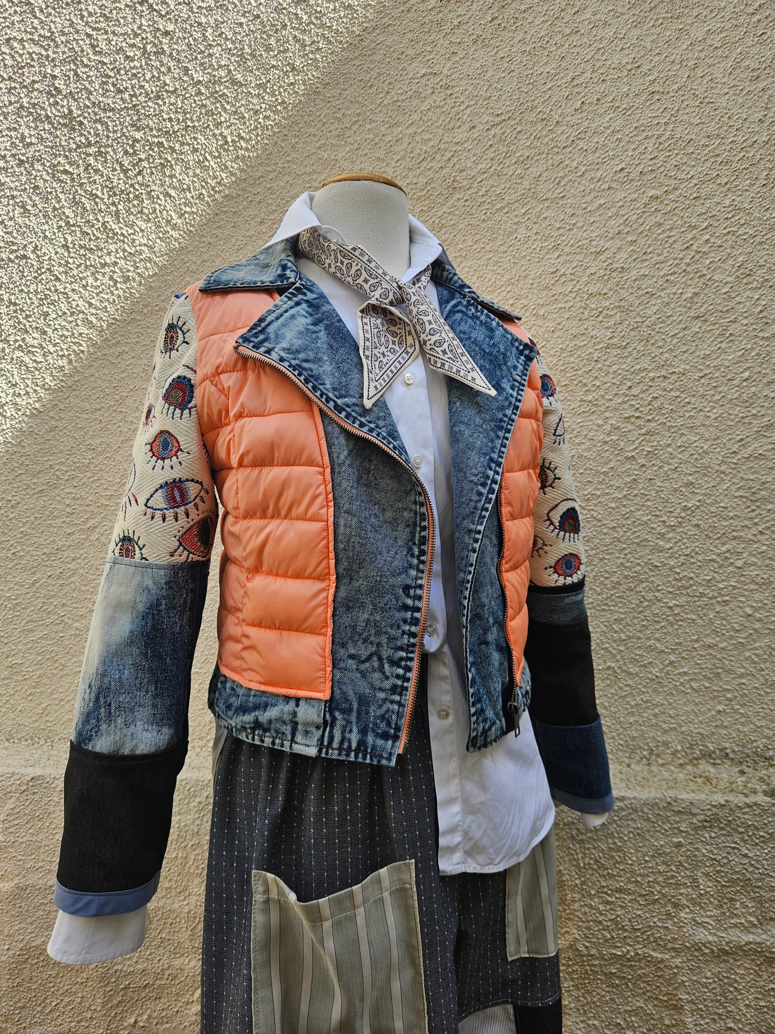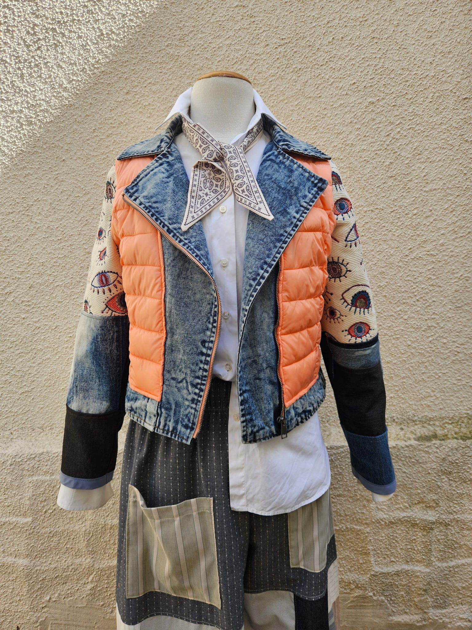 The sleeves are are made from a patchwork of vintage denim & the most beautiful embroidered protection eye pattern on a gorgeous structured cotton twill.